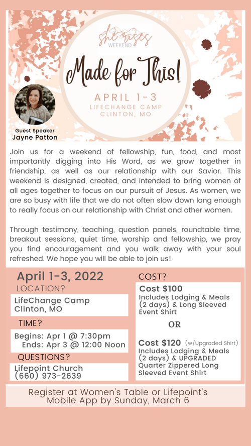 Join us for a weekend of fellowship, fun, food, and most importantly digging into His Word, as we grow together in friendship, as well as our relationship with our Savior. This weekend is designed, created, and intended to bring women of all ages together to focus on our pursuit of Jesus. As women, we are so busy with life that we do not often slow down long enough to really focus on our relationship with Christ and other women. This weekend is designed to do just that!